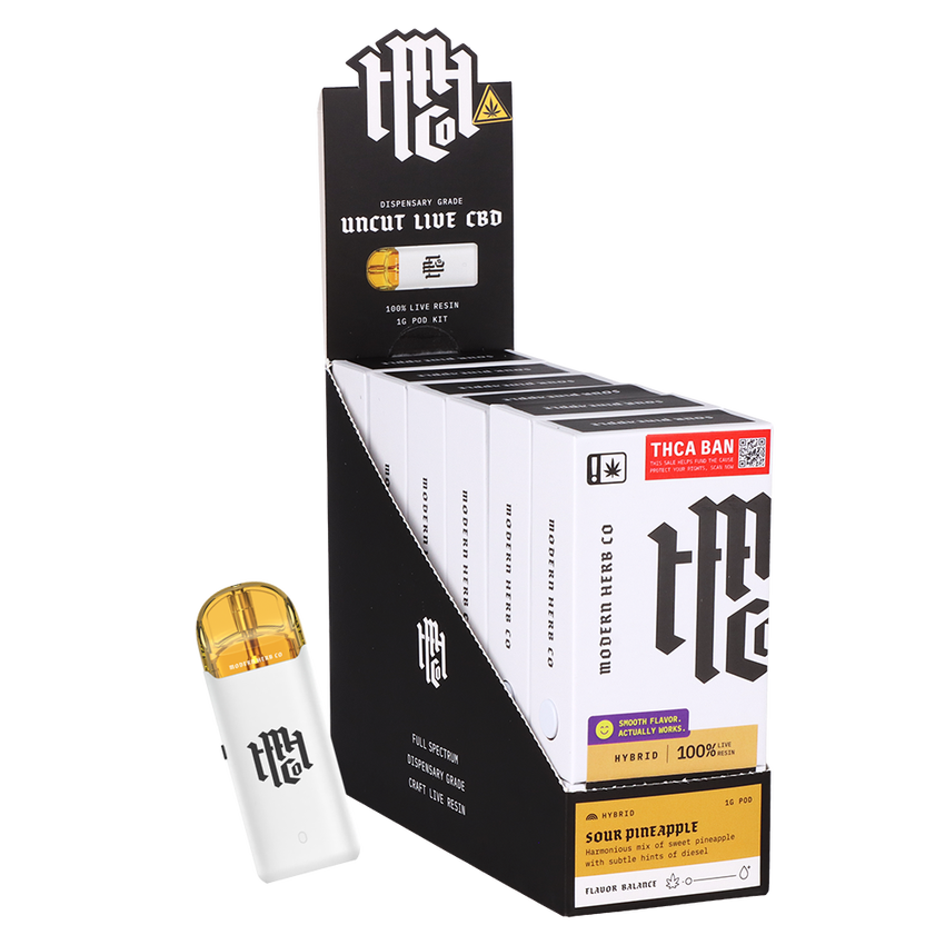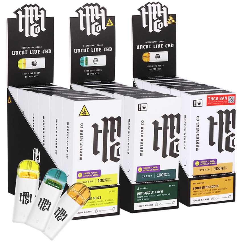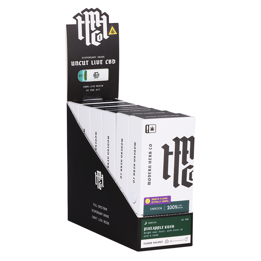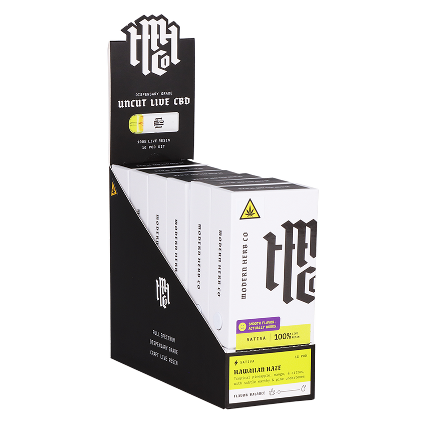 These Live Uncut CBD Pod Starter Kits from Modern Herb Co include a 1 gram vape pod and a reusable pod battery that functions with all Modern Herb Co pods. Each pod is filled with a delicious blend of full spectrum hemp, rich in cannabinoids and terpenes, with no additivies